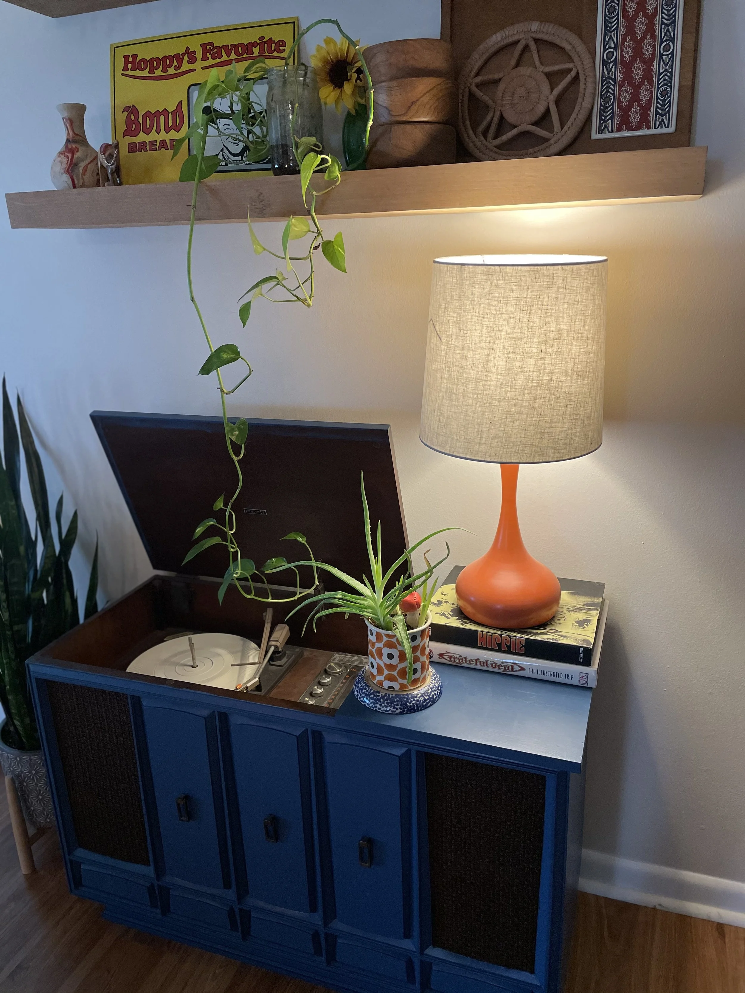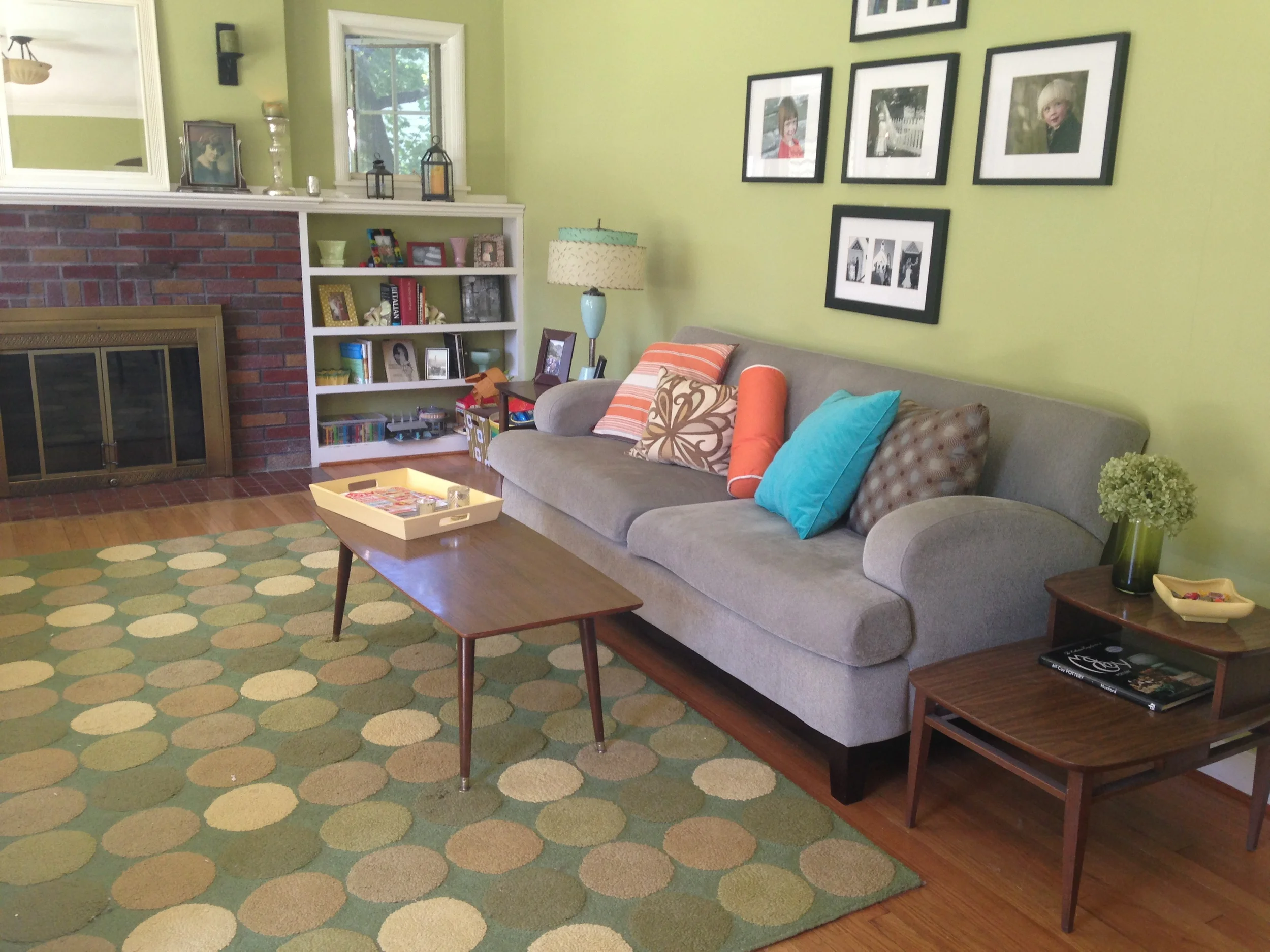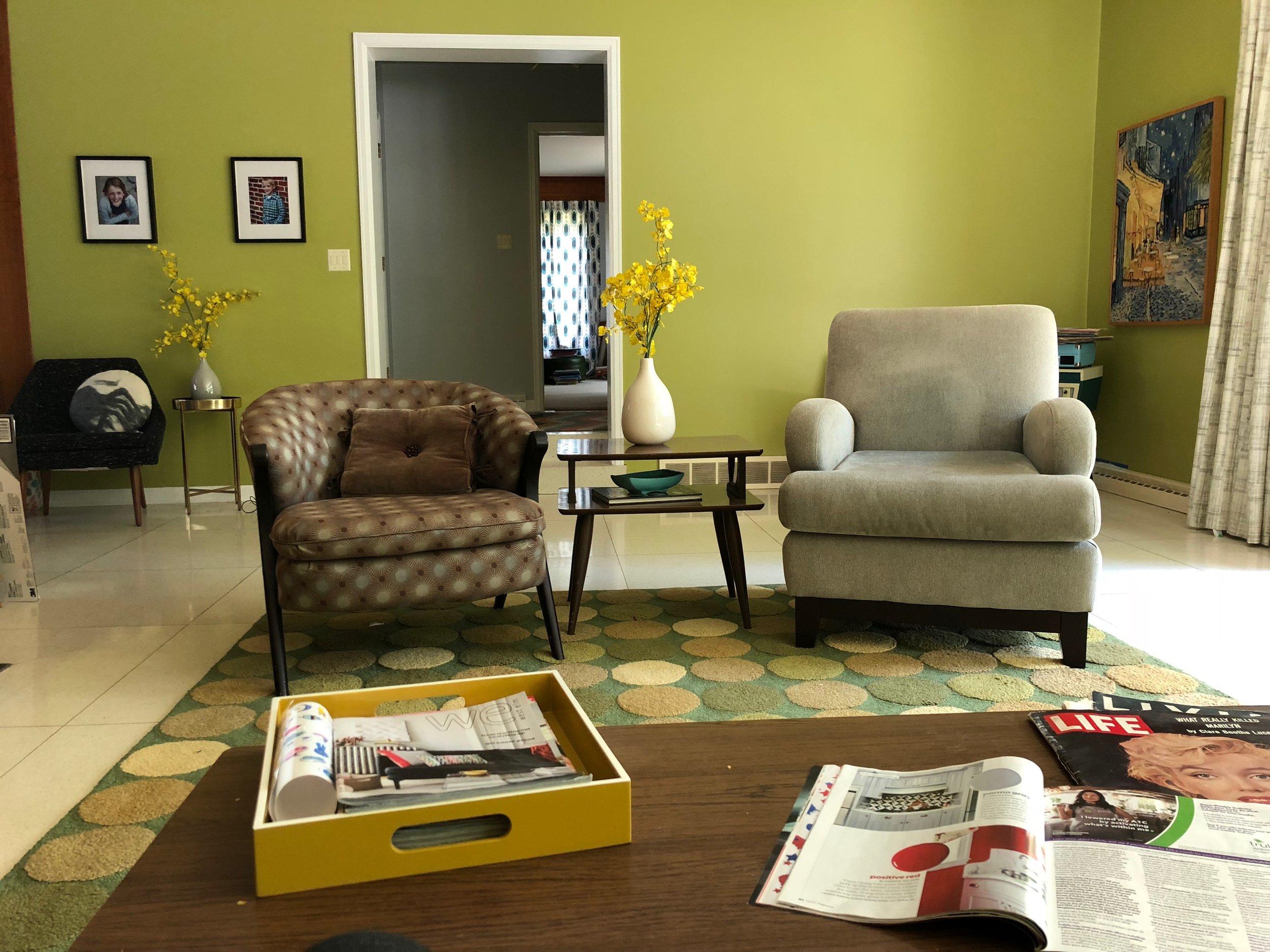 Did I mention personality?! Again, we see a bright throwback retro orange lamp and to compliment, the weedy, creamy colors in this green beauty fit right in. Fun coffee table books create interest and are powerful statements and great conversation starters!