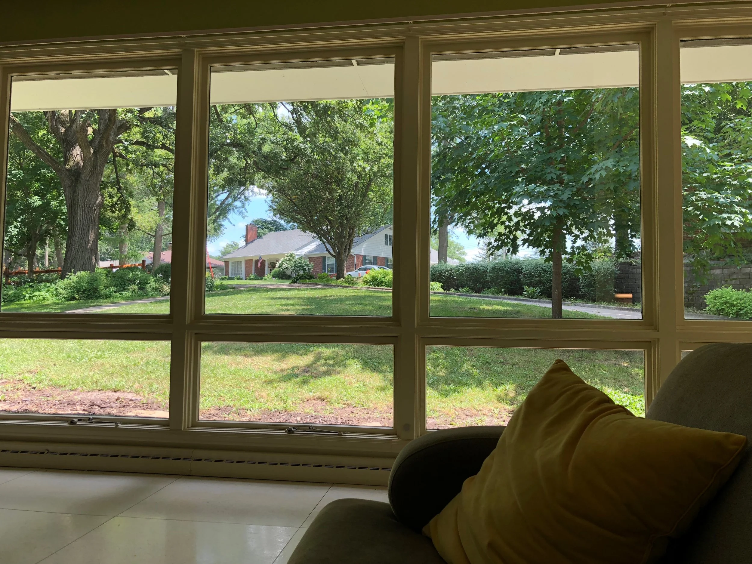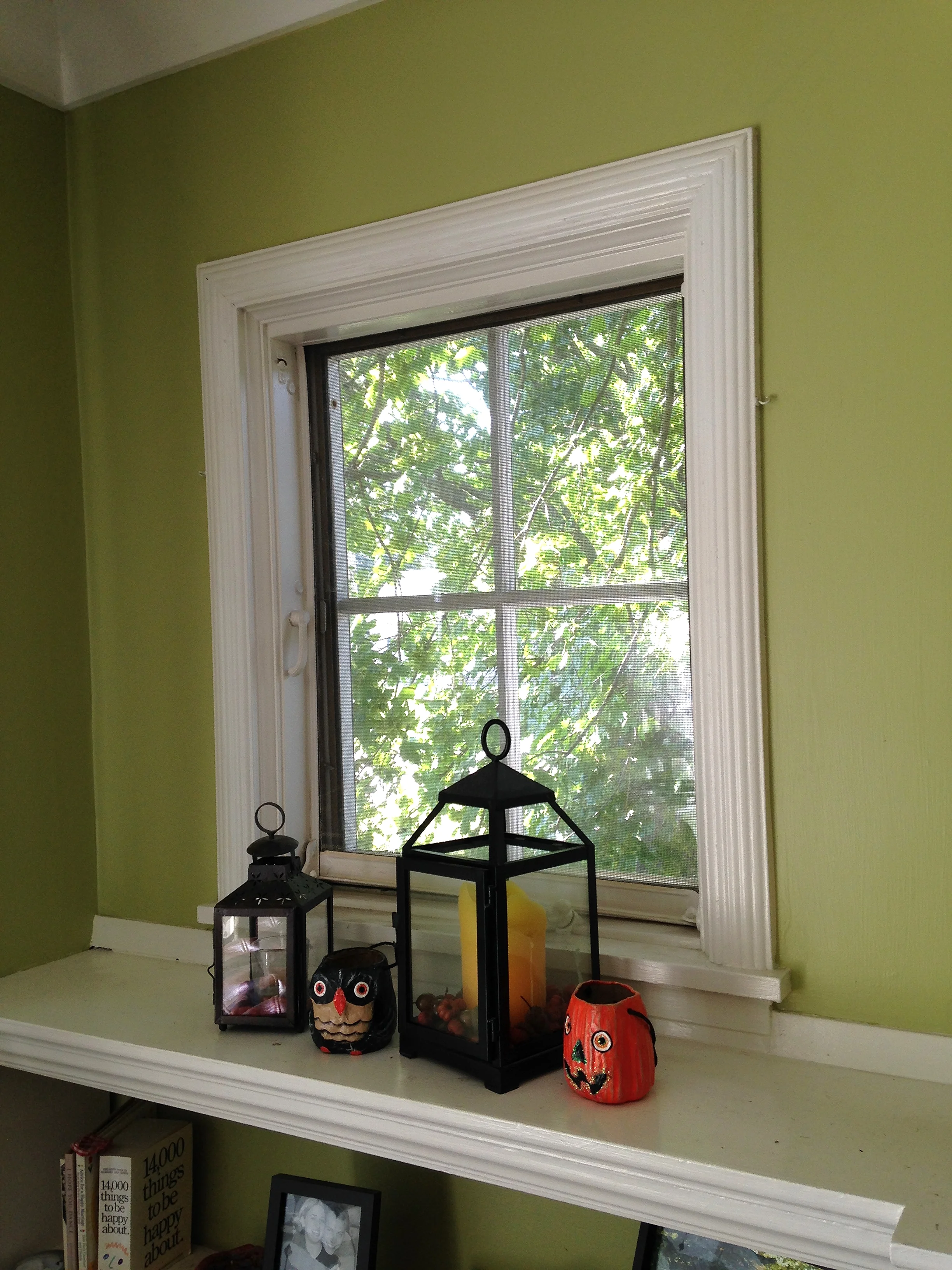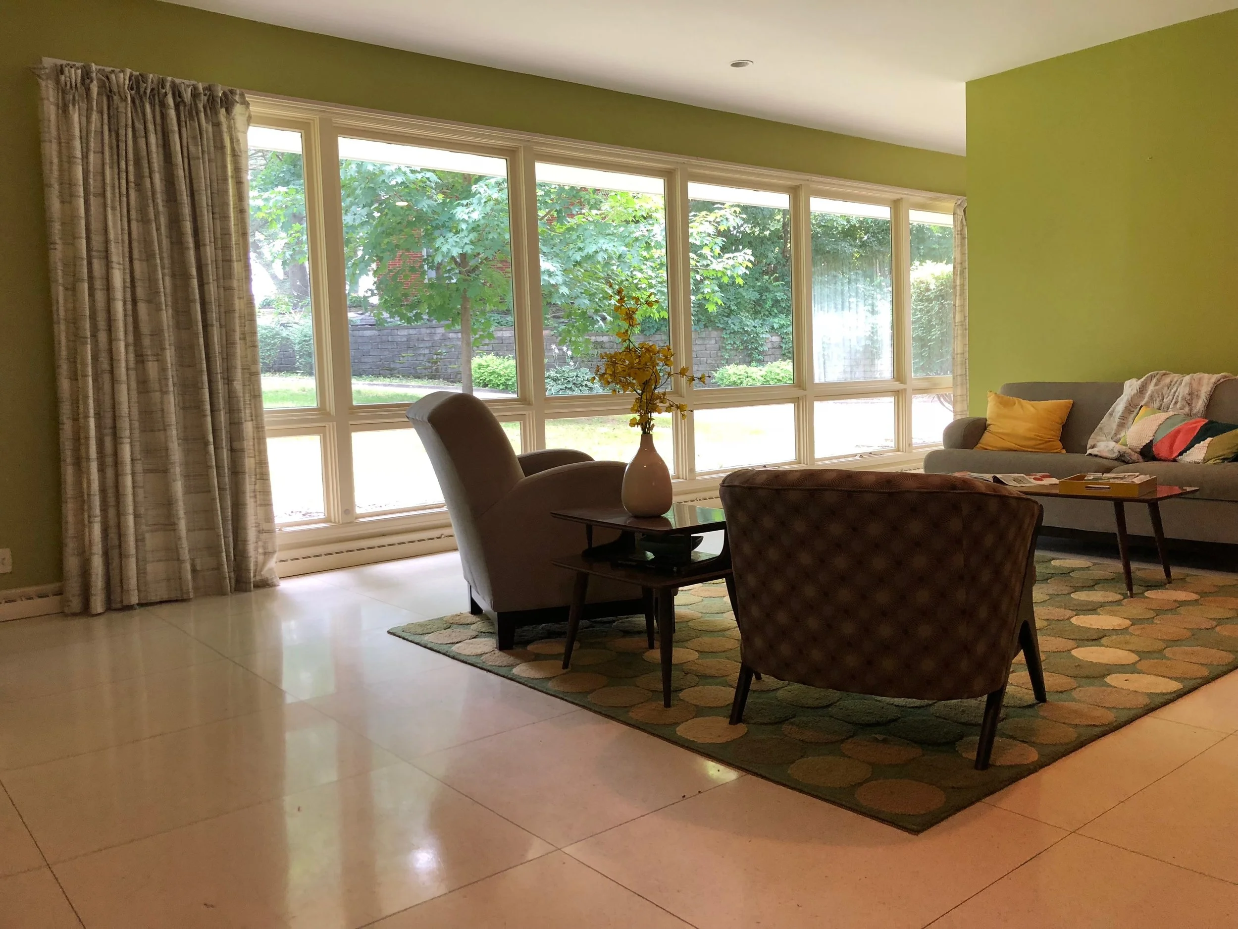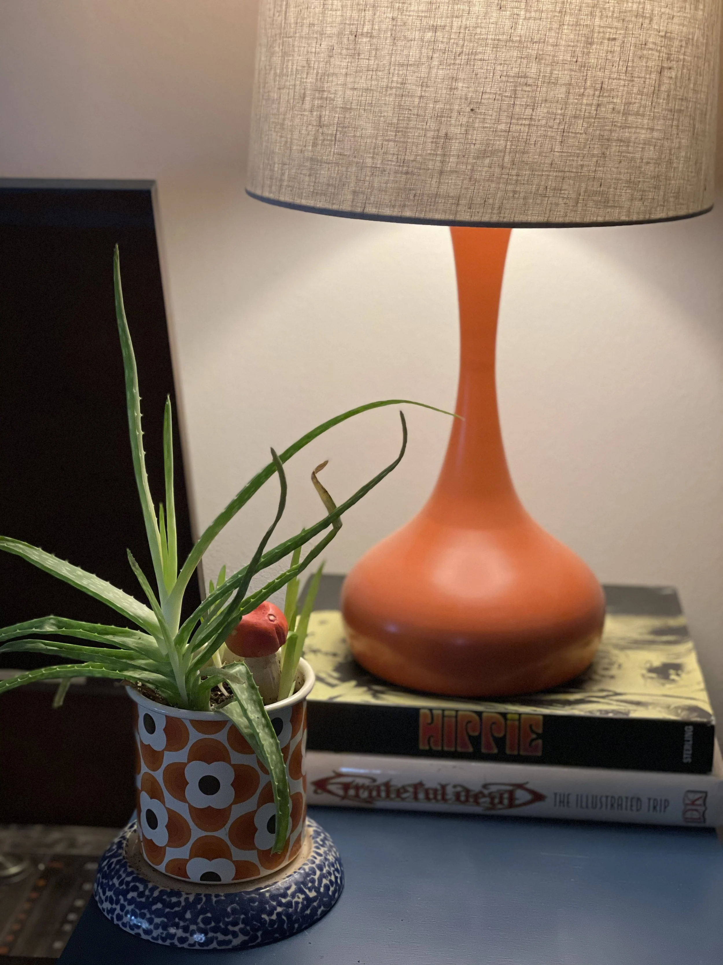 Did I mention personality?! Again, we see a bright throwback retro orange lamp and to compliment, the weedy, creamy colors in this green beauty fit right in. Fun coffee table books create interest and are powerful statements and great conversation starters!