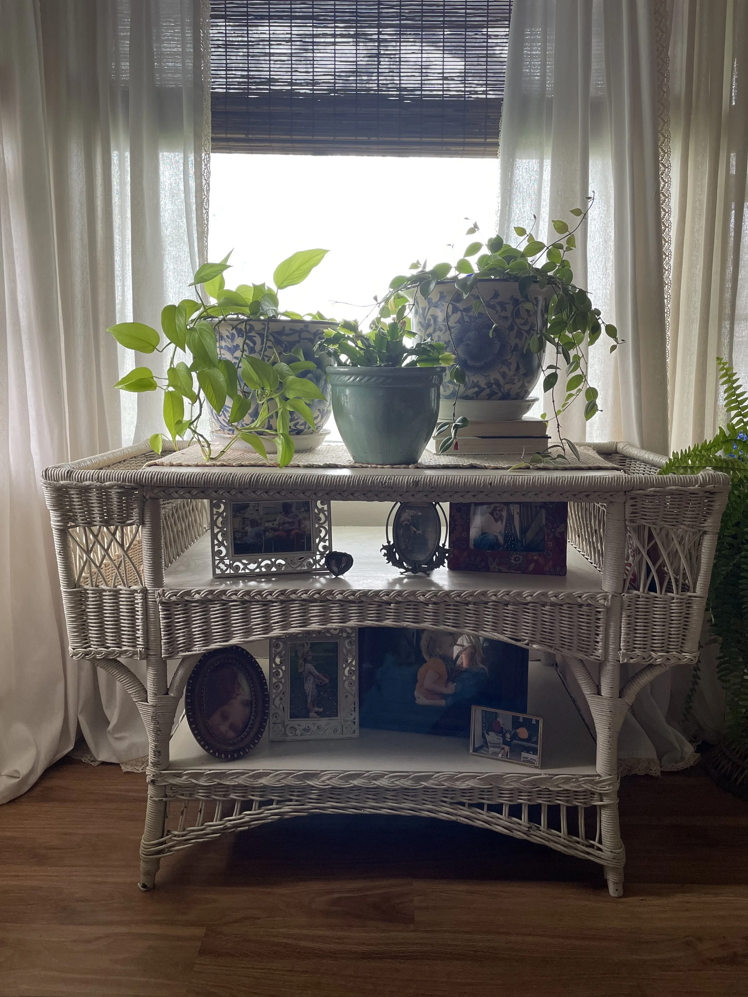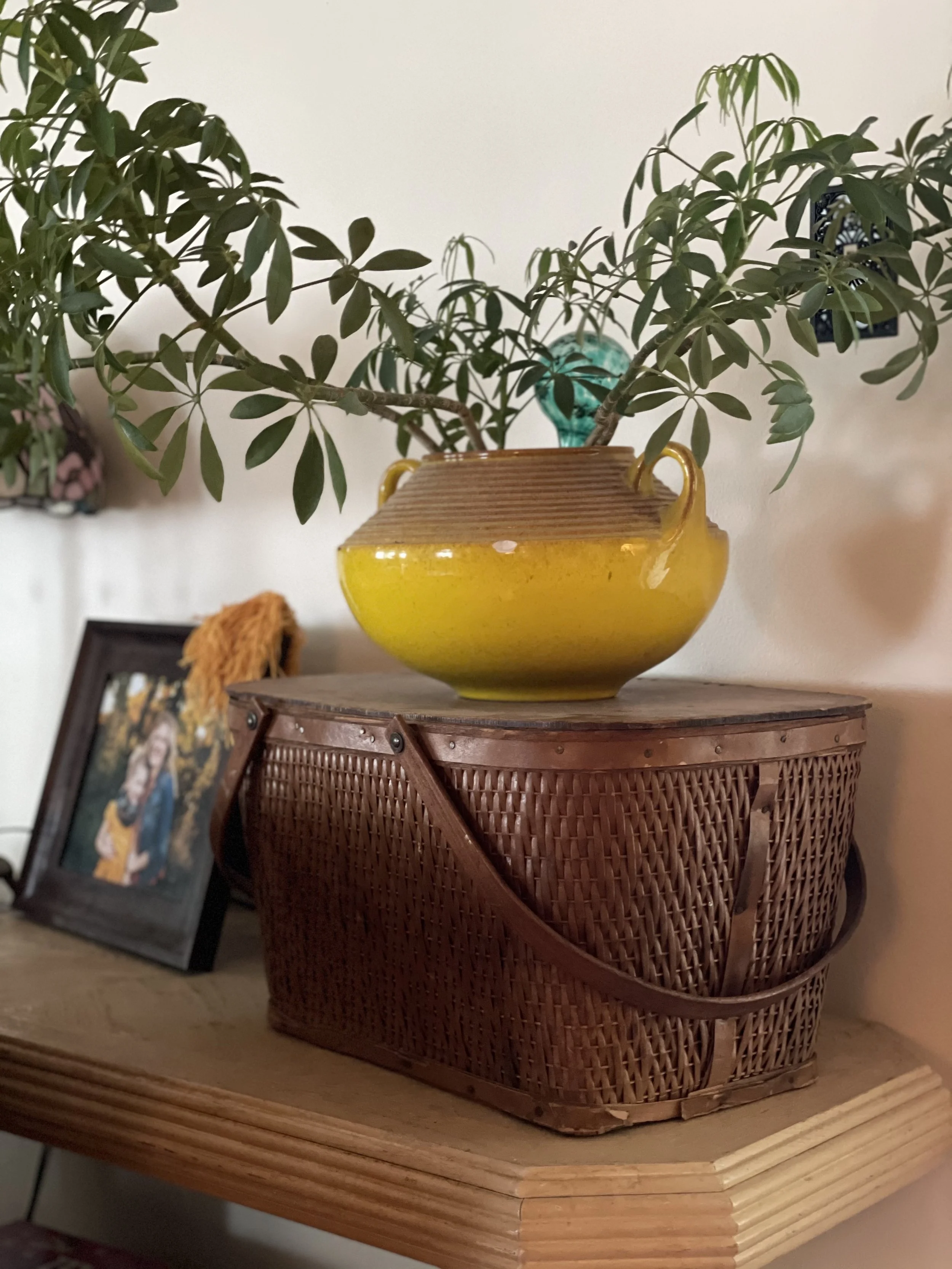 Baskets are essential to the boho vibe. This one is an antique and serves the purpose of hugging and elevating this unique plant in a eye pleasing way. Let us not forget to mention the yummy yellow pot. This vinette adds the perfect touch to an otherwise boring table top.